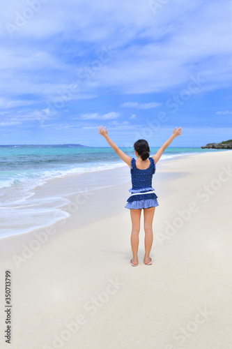 ビーチに立つ女の子(沖縄 宮古島 長間浜 後姿)