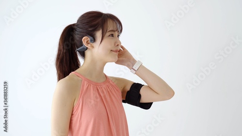 music, hear, people, woman, earbud, headset, smartphone, fitness, exercise, training, diet, cosmetic, health, beauty, indoor, exercise, house, home, live, gym, sport, alone, young, beauty, japanese, asian, chinese