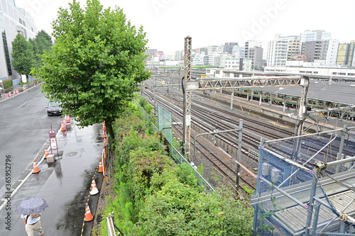 rain, tokyo, rail, overcast, city, building, landscape, sky, route, architecture, travel, urban, green, park, view, city landscape, wood, transport, nature, bridge, transportation, horizon, house, panorama, train, traffic