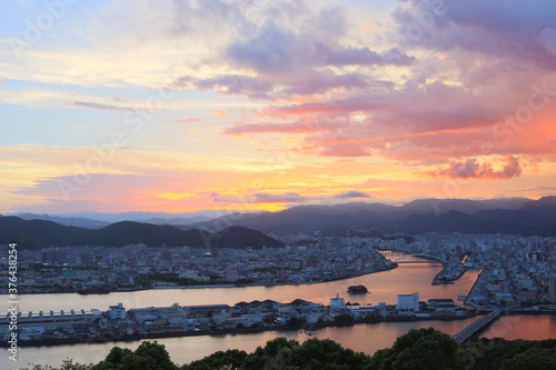 stream, sunset, summer, dramatic, enjoy, emotion, cloud, light, orange, red, lovely, clean, nature, landscape, dusk, sky, town, building, bridge, copy space, background, view, view, mountain, tour tourism, tourist attraction, travel, refresh, relaxation, vacation, vacation, shikoku, japan