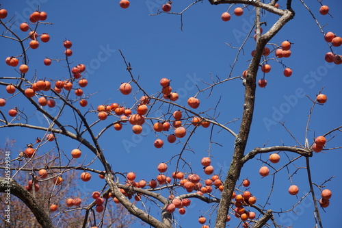 blue skies, persimmon, persimmon, fall, winter, blue, orange, wood, background, image, contrast, look up