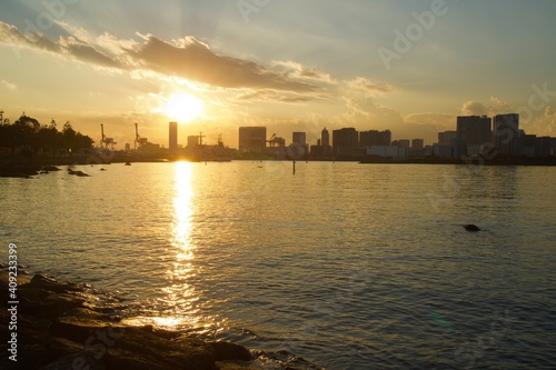 odaiba, sunset, coastline, sunset, city, horizon, water, stream, sky, night, landscape, panorama, tonight, city landscape, urban, evening, sea, building, travel, sun, downtown, view, architecture, cloud, new, silhouette
