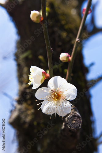 flower, spring, flower petals, plant, early spring, nature, wood, branch, full bloom, white, sum, landscape, winter, open air, tour tourism, kyushu, japan, park, light, february, sunny, sky, blue skies, blue, sky blue