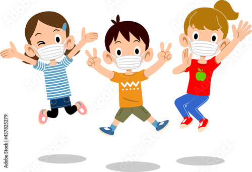 children, mask, summer, jump, boy, girl, lively, chum, sweet, people, fun, light, jump, jumping, smile, health, fellow, friends, best friend, schoolchild, virus, prevention, cold, flu, flat, illustration, vector