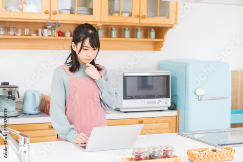 woman, dish, personal computer, apron, receipe, contemplate, hesitate, apprehension, unrest, remote, business, work, telecommuting, online, kitchen, kitchen, laptop, personal computer, cyberspace, homemaker, housekeeping, people, young, girl, pretty, lovely, japanese, health, alimentation, studio, lifestyle, sweet, asian