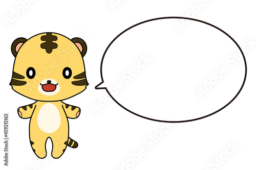 二本足で立っている笑顔の二頭身のトラのイラストと吹き出し