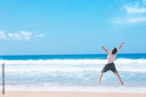 japanese, leisure, open air, summer, sea, beach, sky, expand, youth, increase, people, man, horizon, blue skies, adult, man, jump, beach