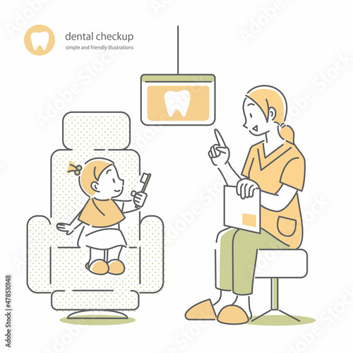 toothbrush, toddler, children, girl, smile, woman, sweet, dental, dentist, teeth, people, dentist, hygienist, treatment, training, monitor, personal computer, version, counseling, conversation, show, two people, patient, personal computer, clipboard, clinic, natural, chair, illustration, japanese