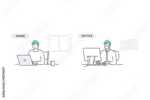 mask, telecommuting, office, home, house, room, personal computer, notebook, working, work, business, work, smile, chair, table, employee, salaried employee, man, young, 30s, people, waist up, illustration, vector