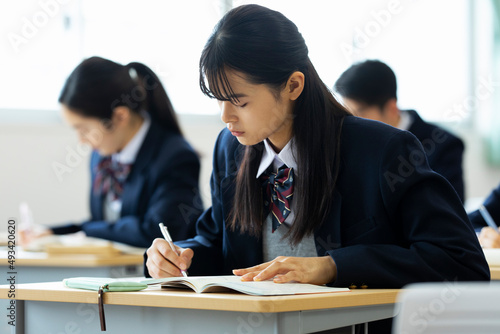 japanese, exam, lifestyle, indoor, school, study, student, training, classroom, contemplate, seated, youth, take, school, write, girl, woman, waist up, people, man, uniform, japan, solemn, schoolgirl
