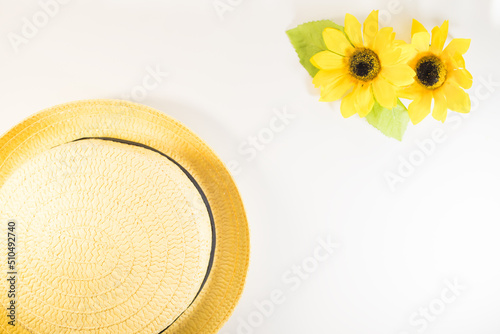background, leghorn, hat, knick knack, hat, sunflower, sunflower, sunflower, flower, flower, flower petals, floral, white, light, season, summer, summer, fashion, material, copy space, background