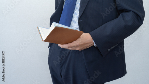 手帳を確認するスーツ姿の男性