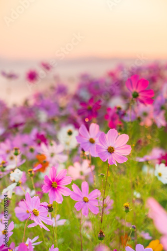 landscape, sunrise, sky, cosmos, flower, meadow, field, grass, wood, sun, pink, plant, sunlight, forest, rural, mountain, blue, countryside, morning, garden, plant
