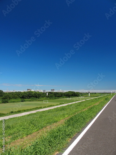 江戸川土手から見る誰もいない猛暑日の江戸川サイクリング道路と河川敷風景