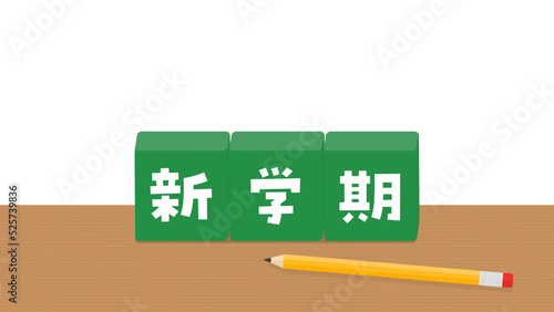 机の上に置かれた新学期の文字が入った緑色のブロック - 学校の言葉の素材