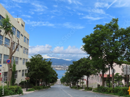 slope, tourist attraction, tour tourism, journey, travel, port, sett, nature, green, daytime, daytime, outdoors, open air, summer, japan, hokkaido, lovely, clean, pretty, sunny, light, asia, copy space, sky, blue skies, blue, landscape, view, plant, green, green, blue, sea, architecture, street