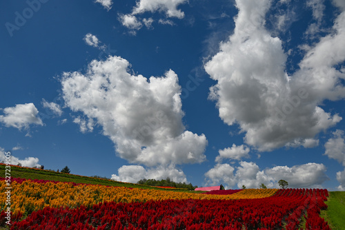 hokkaido, japan, dahlia, sage, flower, hill, cloud, meadow, grass, tour tourism, travel, lovely, blue skies, landscape, colourful, flower garden, wood, summer