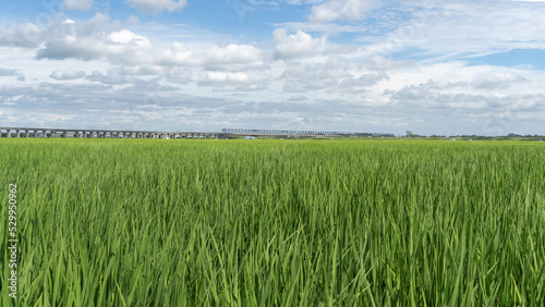 遠くに鉄道の陸橋が見える晴れた日の田んぼの景色
