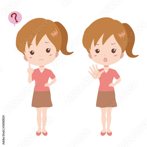 sweet, illustration, problem, mysterious, homemaker, people, woman, resent, lifestyle, expression, student, stop, white background, contemplate, denial, denial, gesture, young, stop, attention, manga, cartoon