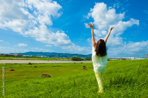 woman, hooray, hand, expand, fun, hope, dream, future, relax, ajar, blue skies, wind, meadow, square, immensity, earth, peace, future, achievement, aggressive, happiness, rendering, body, alone, light, outside