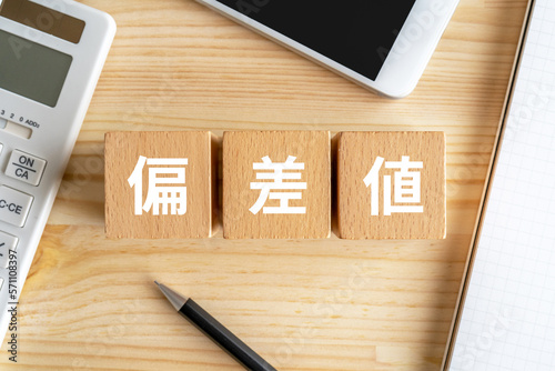 偏差値と書かれたブロック、電卓、スマホ、ノート