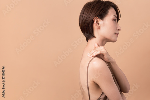 beauty, woman, 30s, japanese, asian, cosmetic, health spa, beauty, profile, back, este, epilation, crunch, healthy, beige, copy space, health, lovely, smile, studio, elegant, polish, skin, brown, sarong