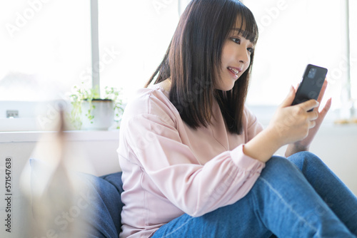 people, woman, woman, girl, young, youth, woman, japanese, japan, portrait, indoor, room, indoor, bedchamber, seated, cushion, couch, relax, vacation, smartphone, smartphone, mobile phone, lifestyle