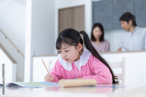 people, indoor, japanese, asian, lifestyle, family, woman, woman, mother, mother, mother, man, father, father, father, children, daughter, girl, woman, training, child rearing, home, house, seated, homework, study, contemplate