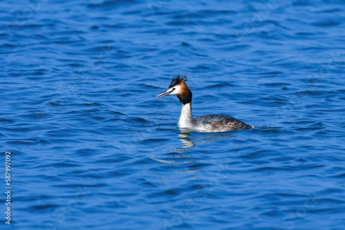 早春の港の海で見られる飾り羽が美しい冬の渡り鳥カンムリカイツブリ