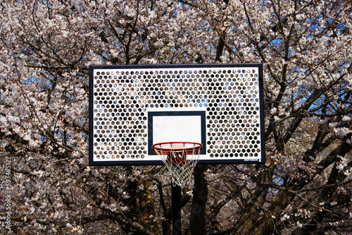 桜に囲まれたバスケットゴール