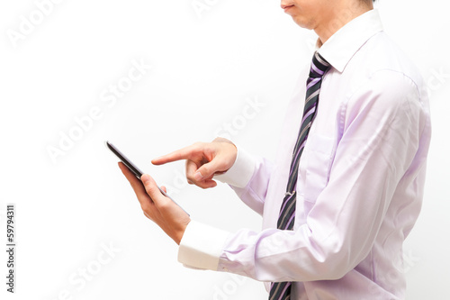 businessman, salaried employee, cravat, suit, tablet, terminal, cyberspace, personal computer, white background, version, presentation, man, employee, office, smartphone, mobile