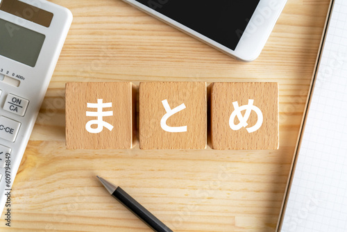 まとめのイメージ|まとめと書かれたブロック、電卓、スマホ、ノート