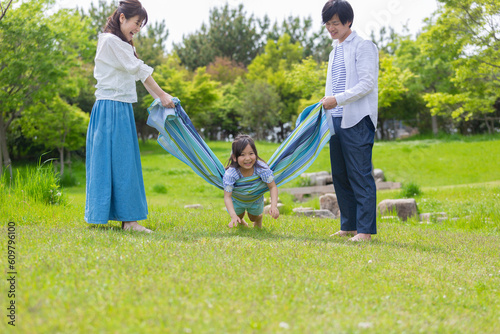 sheet, lifestyle, open air, family, squat, expand, seated, 30s, children, grass, girl, woman, smile, people, man, chum, japan, japanese, father, mother, daughter, play, toddler