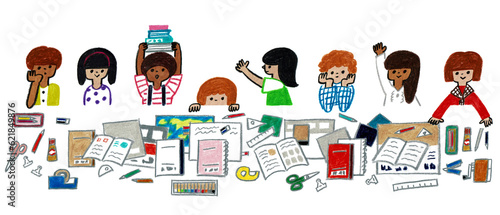 children, study, learning, working, table, seated, girl, boy, pretty, waist up, stationery, pencil box, lead pencil, triangle, ruler, noto, text, text, paste, bondo, tape, partnership, clip, eraser, stationery, book, smile, origami, handwriting, illustration, training, people, crayons, scissors, group, asian, japanese, white, black man, international, global