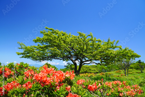 azalea, azalea, plateau, mountain, meadow, nature, landscape, full bloom, flower, verdure, summer, refreshing, blue skies, sunny, vivid, lovely, clean, tourist attraction, tour tourism, travel, leisure, outdoors, hike, trek, japan