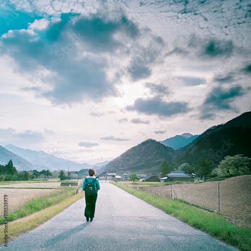 不穏な空の下、一人歩く初老の女性