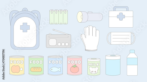 disaster, reserve, set, food, first aid kit, flashlight, radio, battery, mask, water, milk, canned, antiseptic, alcohol, evacuation, illustration, wallpaper, background, cartoon, set, design, seamless, bag, preparation, backpack, vector, icon, blue