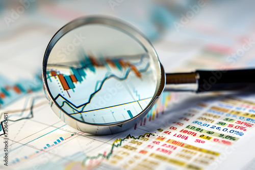 拡大鏡の虫眼鏡で経済や株価、業績のチャートグラフにピントを合わせている