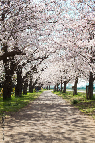 cherry blossom, full bloom, sakura, sakura, blue skies, route, promenade, tunnel, spring, early spring, bank, view, flower, flower petals, walk, park, japan, nature, landscape