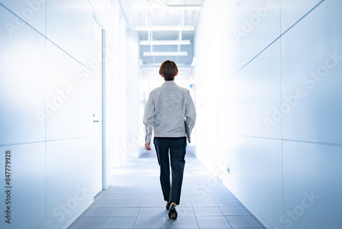 歩く作業着を着た女性の後ろ姿