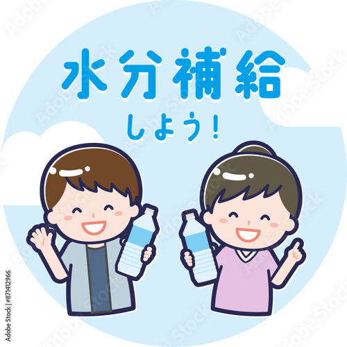 heat wave, summer, hot, moisture, refill, measure, prevention, plastic bottle, water, drink, soft drink, woman, man, smile, happy, adult, 30s, expression, feeling, pose, sweet, people, illustration, vector, infographic, material