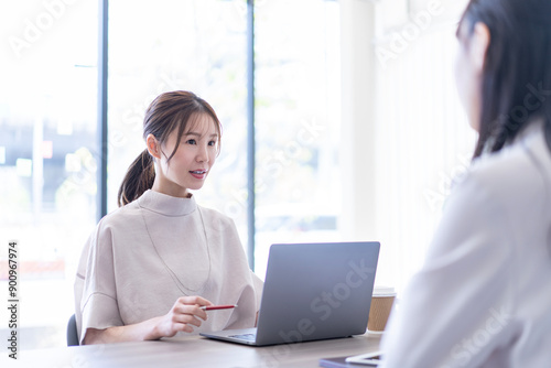 people, japanese, woman, 30s, young, business, work, two people, indoor, office, corporation, office, boardroom, waist up, seated, meeting, meeting, solemn, personal computer, notebook, coffee, speaking, conversation, computer, businesswoman, desk, smiling, team, technology, cyberspace, person, professional