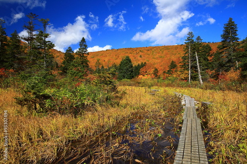 fall, blue skies, sky, cloud, tour tourism, showplace, journey, landscape, nature, sunny, travel, northeast, bog, tourist attraction, japan, mountain, plant, akita, leaf, national park, view, meadow, wood, red, yellow, asia, wetland, field, grass, weed, wildflower