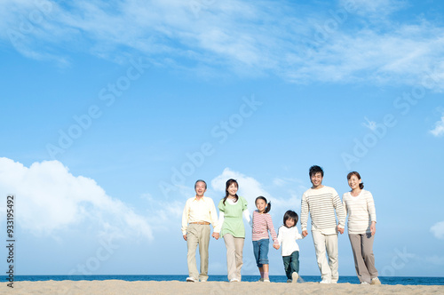 砂浜を歩く三世代家族