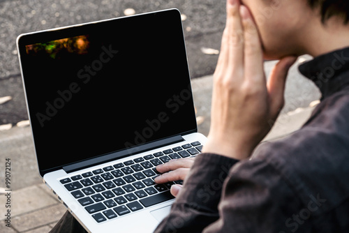 man, young, japanese, laptop, notebook, business, image, contraption, connect, net, cyberspace, technology, pursuit, persistence, bench, open air, personal computer, frontier, design, designer, display, screen, monitor, asian, communication, unrest