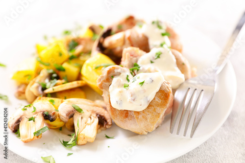 pork meat, tenderloin, filet, mignon, potato, mushroom, sauce, food, meal, meat, grilled, juicy, fillet, dinner, lunch, roasted, cookery, culinary, pork meat, cream