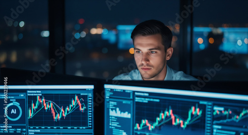 Financial Analyst Using AI Predictive Analytics at Night