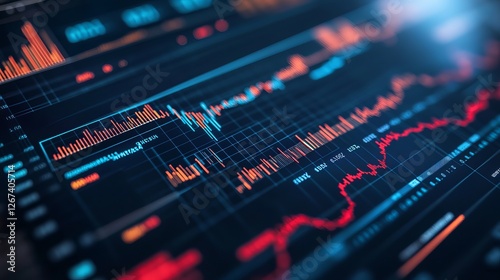 Financial Data Analytics Screen Display Red Orange Blue Stock Market Charts Graphs Business Technology Digital Information Investment Trading Economic