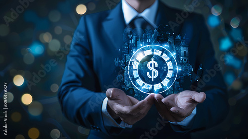 Financial Growth and Time: Businessman Demonstrates ROI Concept with Holographic Icons