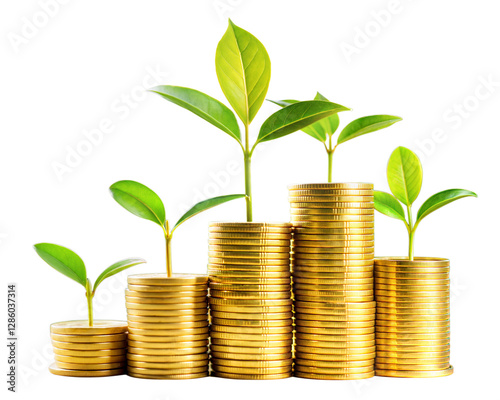 Financial Growth Concept – Stacked Gold Coins with Green Plants